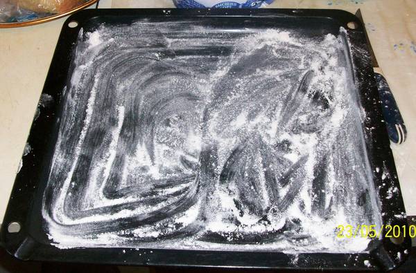 - Посыпать противень мукой, ничем НЕ СМАЗЫВАТЬ!